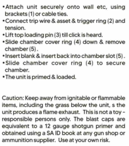 Whilst this product is designed and classified as an industrial tool, it is used to deter trespassers and, to notify owners of items of intrusion or possible theft, including the protection of any of their assets, so when tripped, will trip and give off a BIG BANG sound to alert the owners, of someone penetrating the protected area, or removing items without consent.