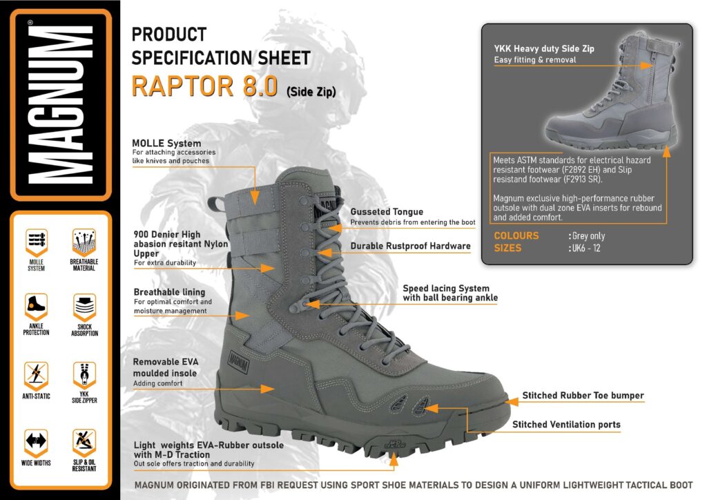 The Magnum Raptor offers everything you need in a tactical boot. Lightweight, comfort and excellent grip to carry you through tough days on the job. Sleek design and extra features makes the Magnum Raptor your go-to for tactical use.
