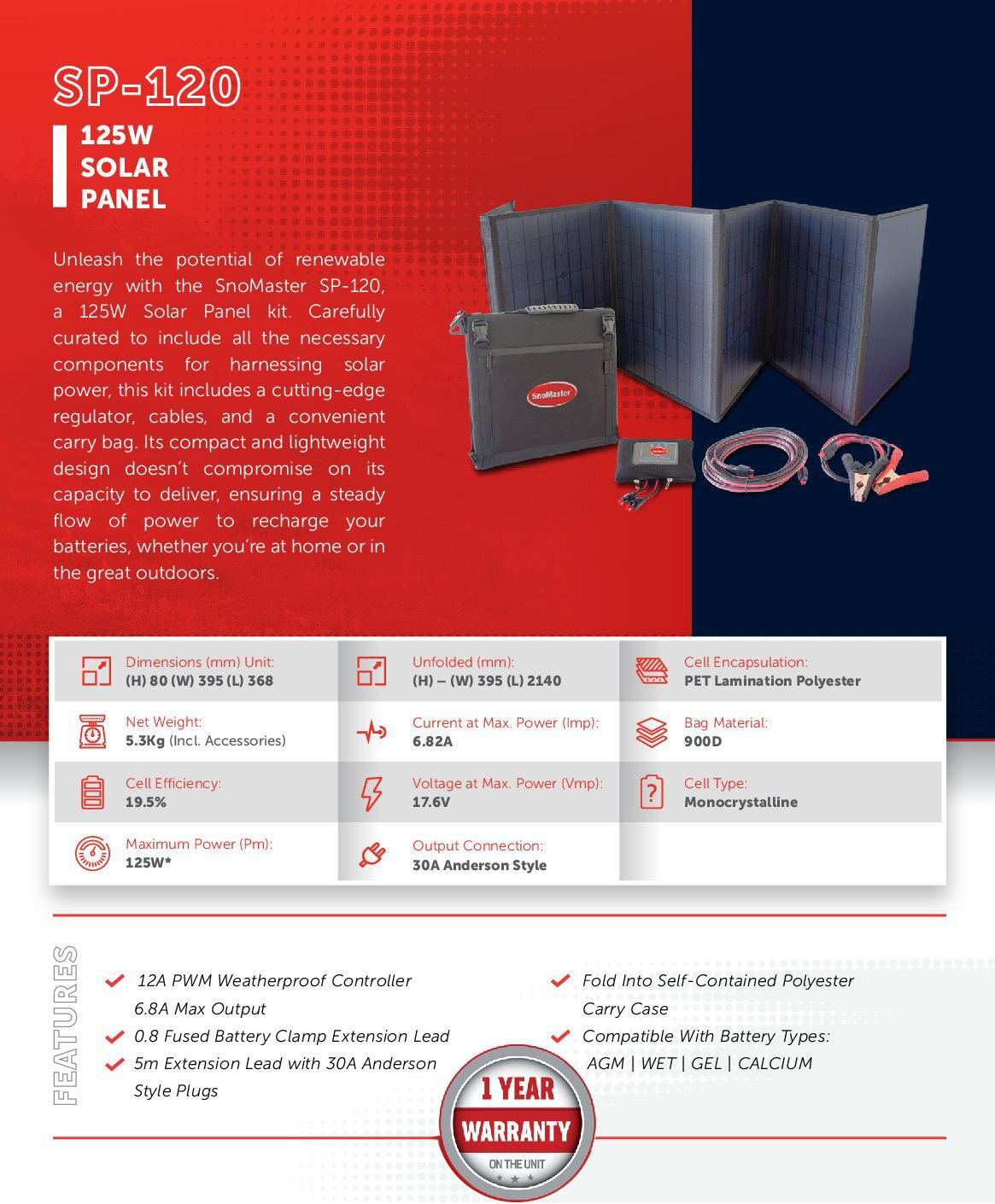 Unleash the potential of renewable energy with the SnoMaster SP-120, a 125W Solar Panel kit. Carefully curated to include all the necessary components for harnessing solar power, this kit includes a cutting-edge regulator, cables, and a convenient carry bag. Its compact and lightweight design doesn’t compromise on its capacity to deliver, ensuring a steady flow of power to recharge your batteries, whether you’re at home or in the great outdoors.