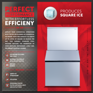 Amplify your commercial operations with the SM-150 Plumbed-In Commercial Ice-Maker. With the capacity to create up to 147kg of square ice blocks per day, this durable stainless steel machine matches the momentum of your bustling restaurant, lively bar, or vibrant cocktail lounge. Ensuring continuous delivery of pristine ice, this dependable ice-maker keeps your beverages cool and your customers delighted. For the business that never stops, the SM-150 is the workhorse that keeps on delivering, round the clock, every day.