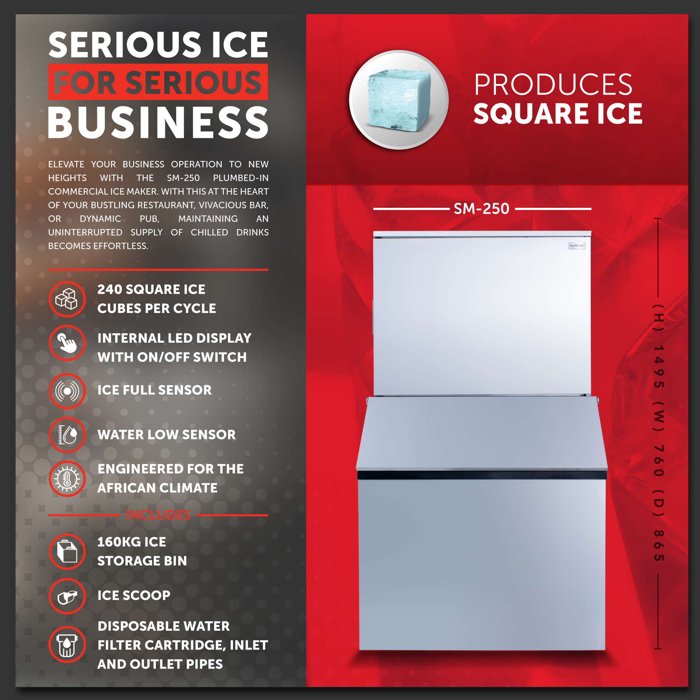 Elevate your business operation to new heights with the SM-250 Plumbed-In Commercial Ice Maker. Engineered to thrive in the most demanding settings, this powerhouse produces up to 250kg of square ice blocks daily. With this at the heart of your bustling restaurant, vivacious bar, or dynamic pub, maintaining an uninterrupted supply of chilled drinks becomes effortless. The SM-250, where superior performance meets unrivaled reliability – it’s not just an ice-maker, it’s a game-changer.