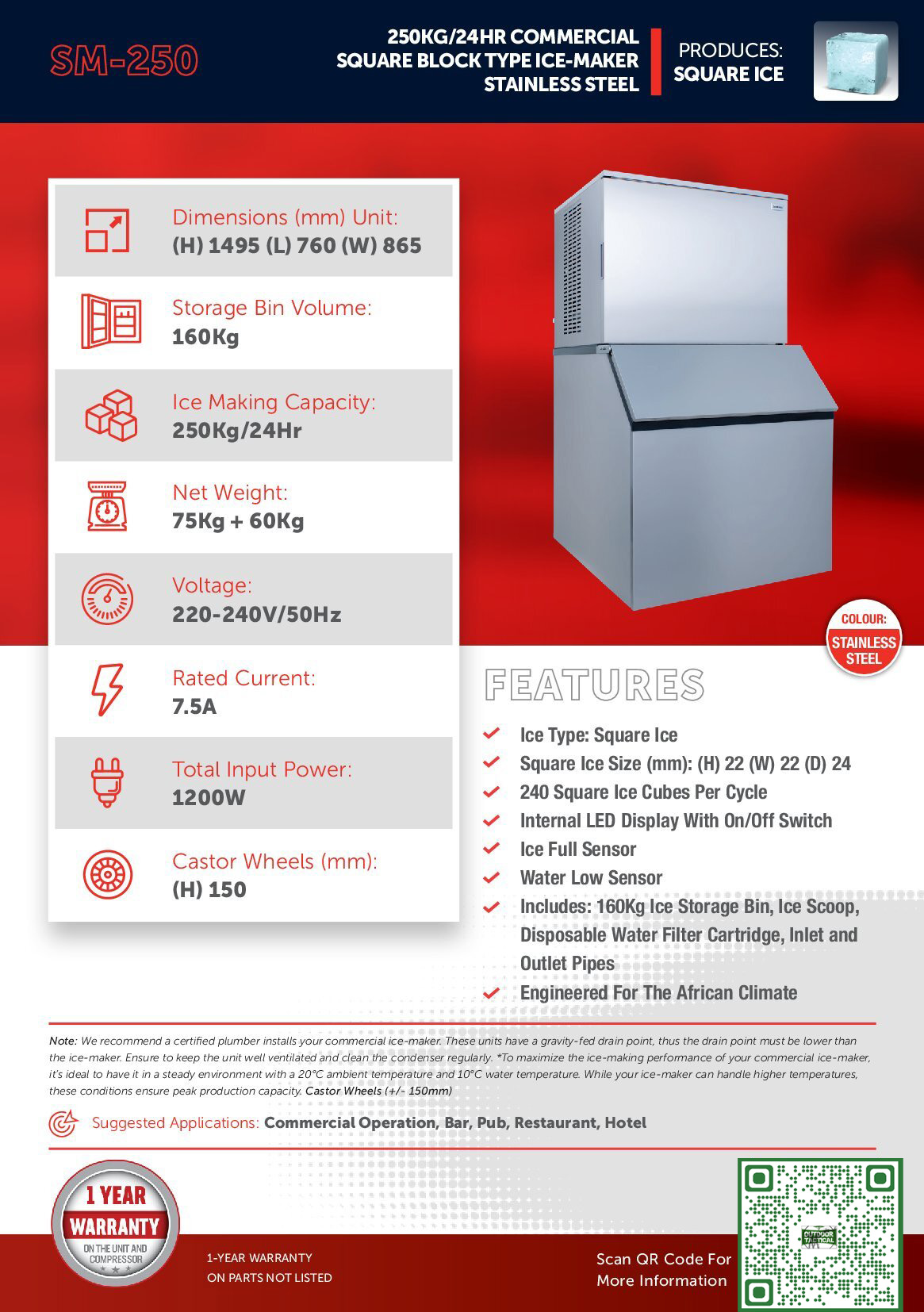 SnoMaster SM-250 250KG/24HR COMMERCIAL SQUARE BLOCK TYPE ICE-MAKER – STAINLESS STEEL (INCLUDING 160KG STORAGE BIN)