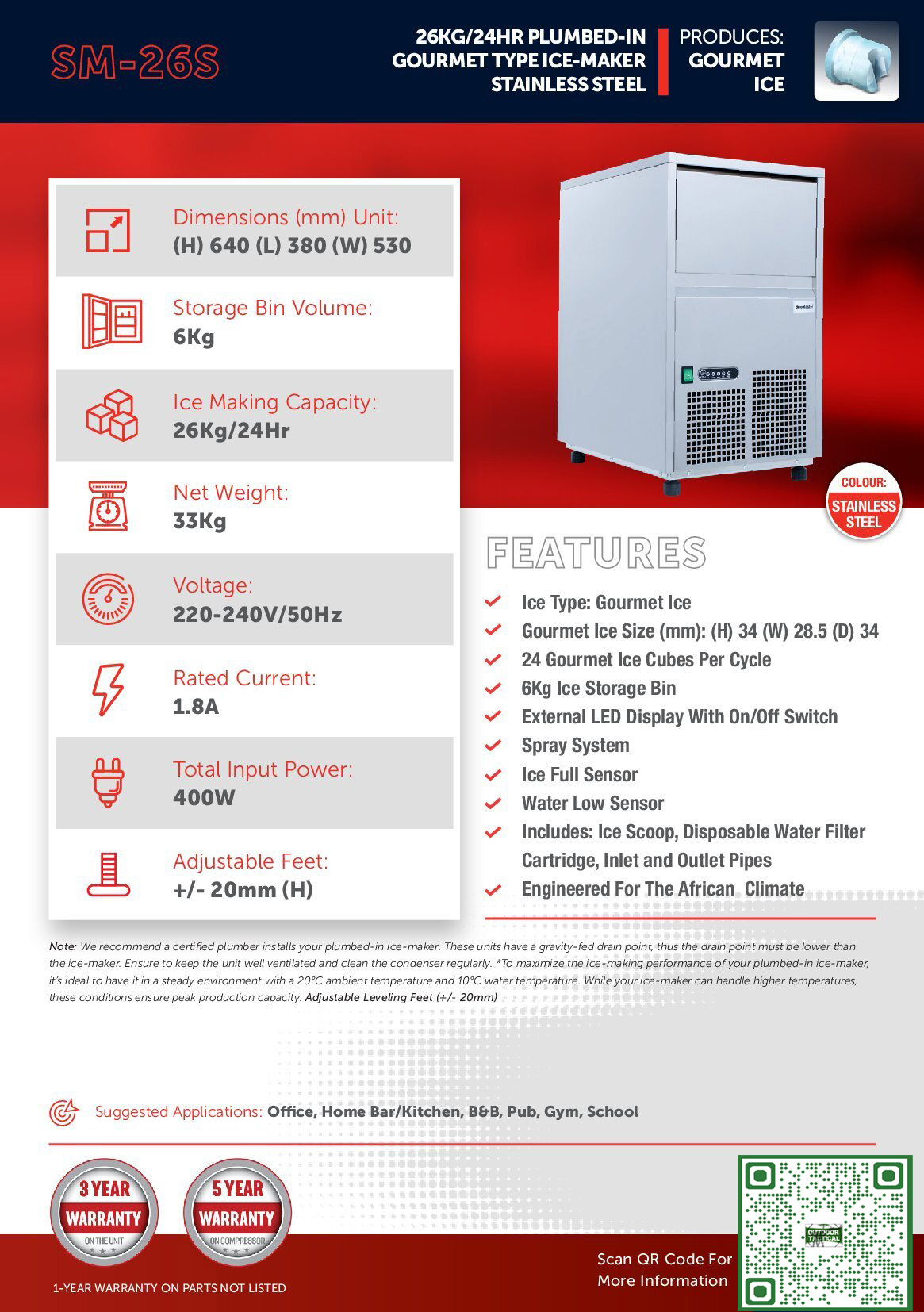 Dive into the world of gourmet ice right at home with the SM-26S Plumbed-in Ice-Maker. This sleek, stainless steel unit delivers up to 26kg of gourmet ice cubes in a 24-hour period. Designed for efficiency and convenience, it’s a game changer for home entertainers and ice aficionados. Say goodbye to water top-ups and let this ice-maker keep your drinks extra chilled and your social gatherings full of fun and sophistication.