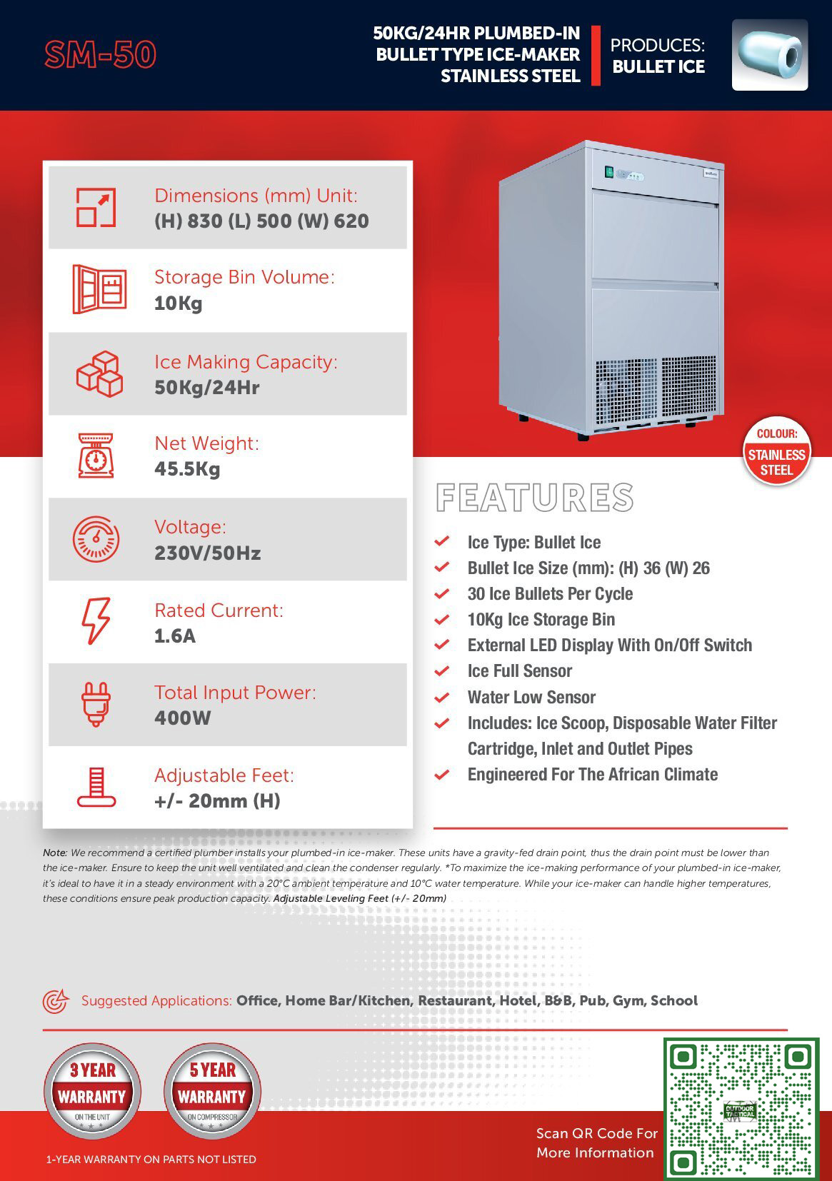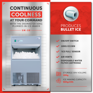 Seize the day with the SM-50 Plumbed-In Ice-Maker, a dual-purpose powerhouse that’s ideal for both home use and small commercial operations. This remarkable unit swiftly produces up to 50kg of bullet-shaped ice in just 24 hours. Encased in durable stainless steel, it’s a perfect match for the passionate home entertainer, small businesses, or any setting where a continuous supply of chilled beverages is a must. Effortless to operate, and with an unfaltering ice supply, this ice-maker smoothly integrates into any scenario, amplifying good times and refreshing drinks.