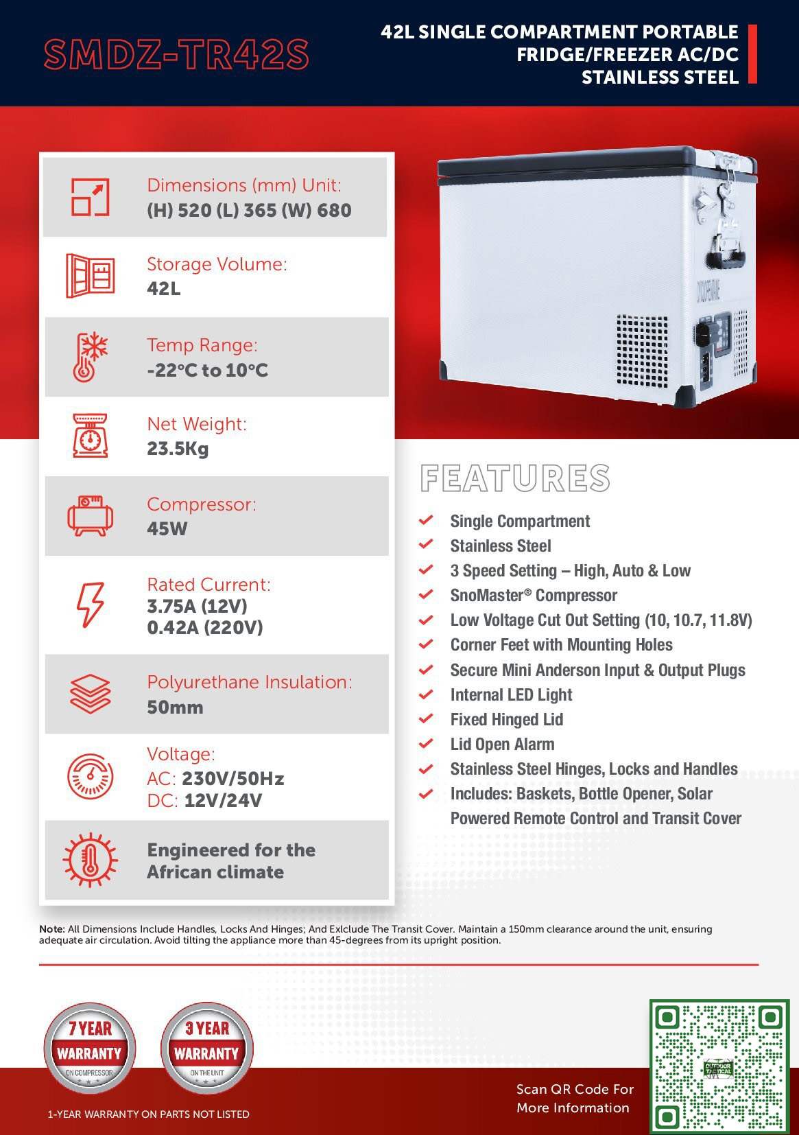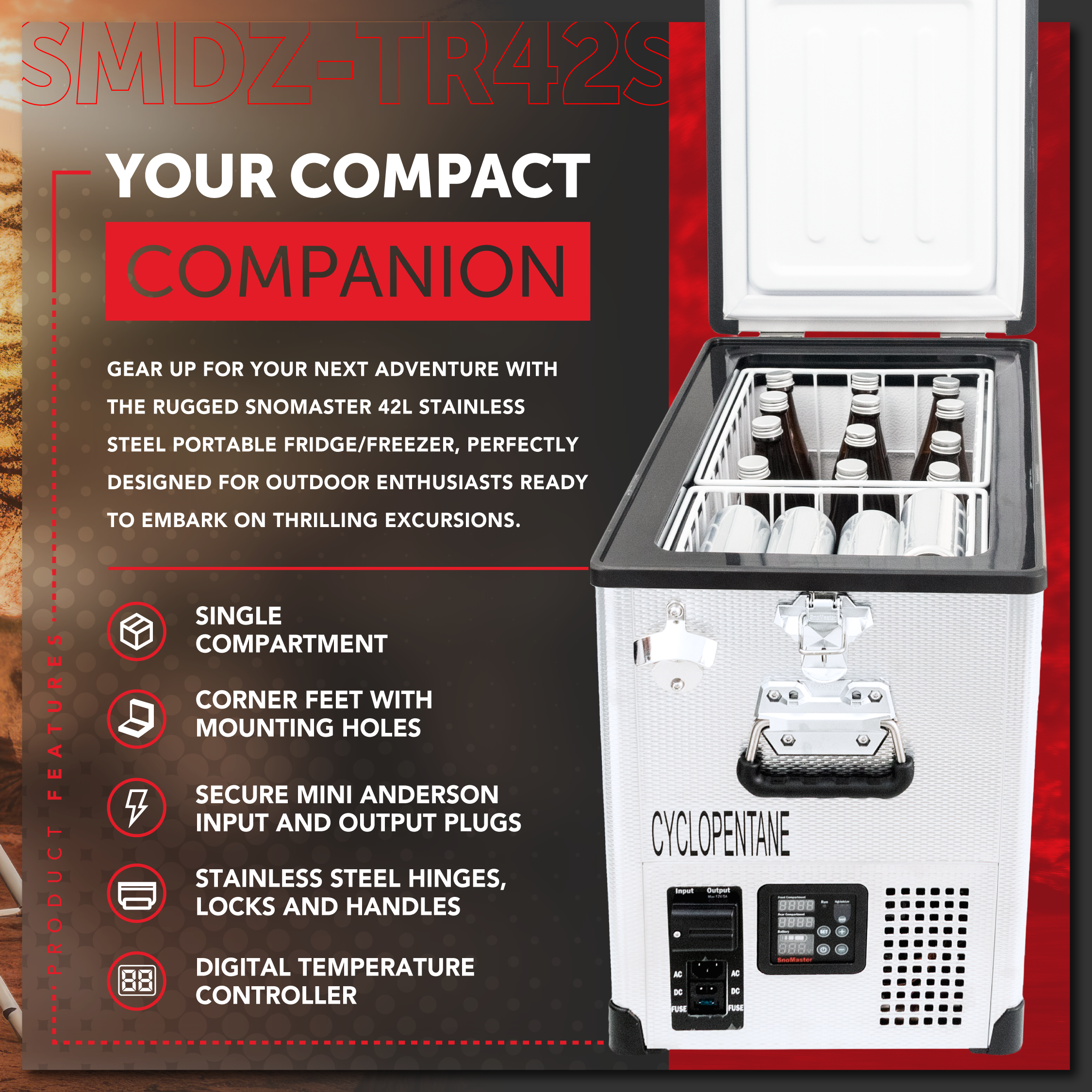 Embark on your next excursion with the robust SnoMaster 42L Stainless Steel Portable Fridge/Freezer. Tailored for outdoor enthusiasts, this model features durable stainless steel construction and convenient removable baskets for organizing supplies. Effortlessly manage your cooling needs with the solar-compatible remote control, and enjoy additional ease with the integrated bottle opener for those relaxing sundowner moments. Complete with a protective transit cover, this fridge/freezer stands as your essential travel ally, ensuring your provisions stay chilled wherever adventure leads.