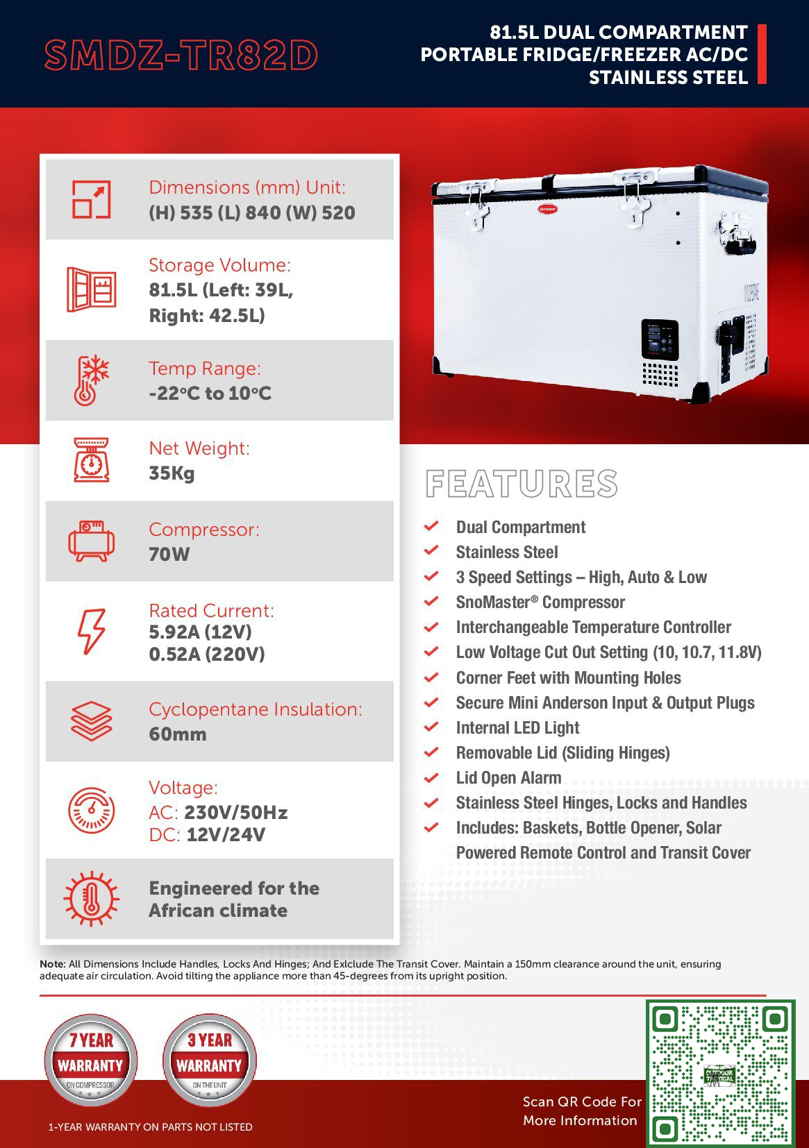 Venturing into the great outdoors just got cooler with the 81.5L Dual Compartment Stainless Steel Fridge/Freezer. With dual compartments, it hands you the freedom to decide – chill all, freeze all, or a mix of both. Its resilience makes it a perfect sidekick, ensuring your food remains fresh, and your beverages frosty, no matter where your adventures lead. So go ahead, explore the wild with the assurance of a well-stocked larder!