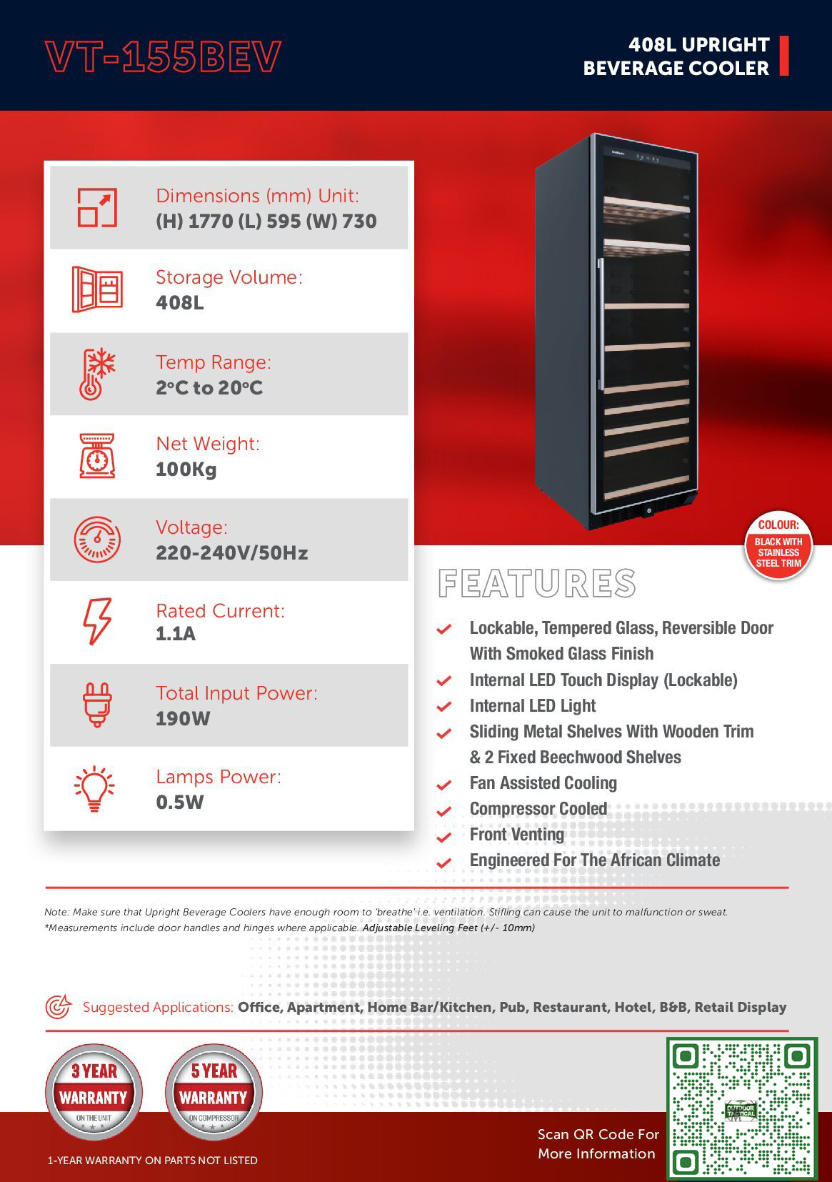 Showcase your collection with confidence and style in the VT-155, where flexibility meets capacity. This spacious upright cooler, dressed in a smoke-tinted glass finish, exudes sophistication. Adjustable shelving comfortably accommodates a diversity of drink sizes, ensuring your entire assortment is kept at optimal chill. Easy to operate, simple to clean, and boasting exceptional cooling performance – it’s your ultimate ally in beverage storage and display.