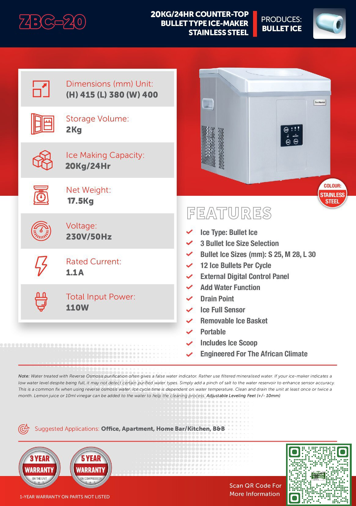 Turn up the chill factor at your gatherings with the ZBC-20 Counter-Top Ice-Maker. This robust appliance, with its sleek stainless steel finish, churns out up to 20kg of ice per day to keep your drinks perfectly cooled. Its intuitive design lets you know when it’s time for a water refill or when the ice bucket is full. A beacon of convenience and efficiency, this ice-maker makes sure you can focus on hosting, while it takes care of the cool refreshments.