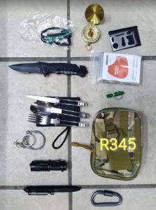 1x flashlight 1x SOG instinct mini knife 1x Whistle 1x Wire saw 1x 12 in 1 multitool card 1x Carabiner 1x Case 1x Fire stick…